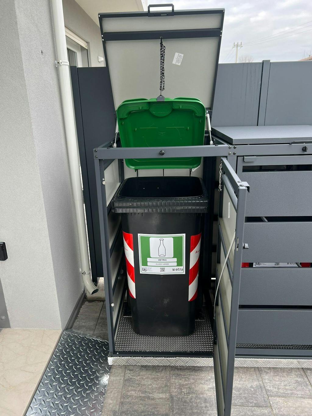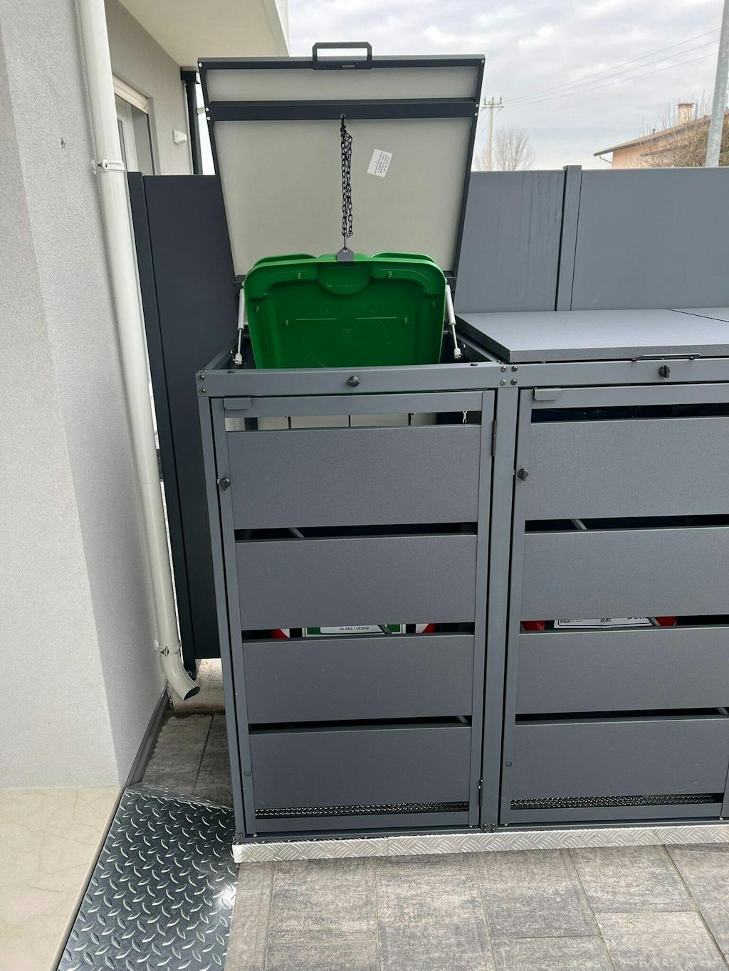 Das Einstellen von 120l Mülltonnen in eine 240er Mülltonenbox ermöglicht eine einheitliche, geradlinige Optik. Die unter Zubehör auswählbaren Ketten sind etwas länger, sodass sie auch für 120l Mülltonnen in 240er Mülltonnenboxen geeignet sind.