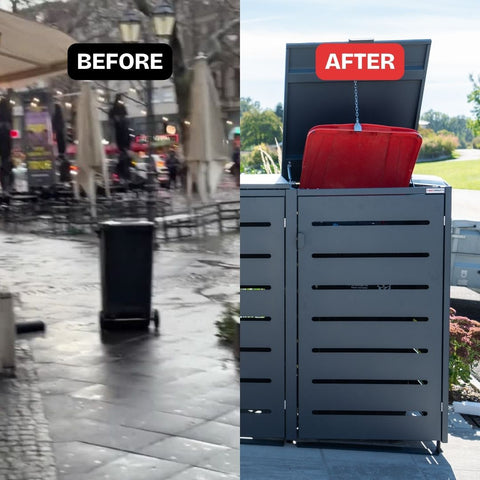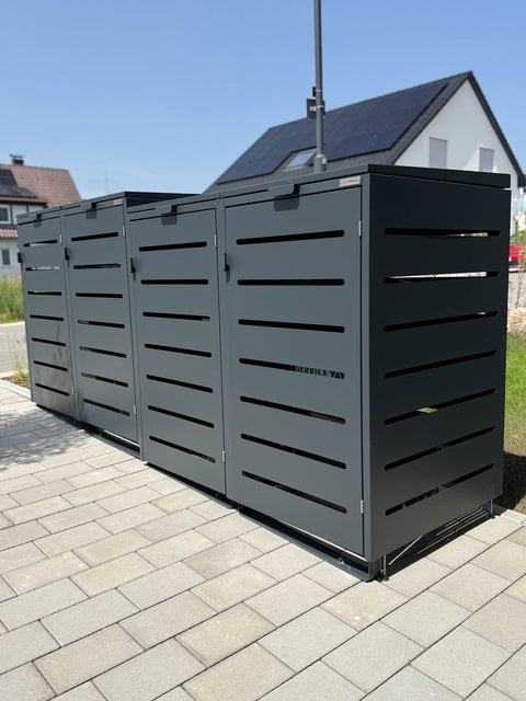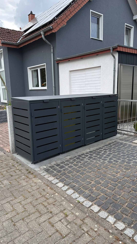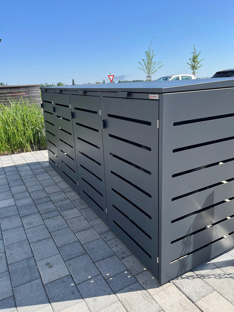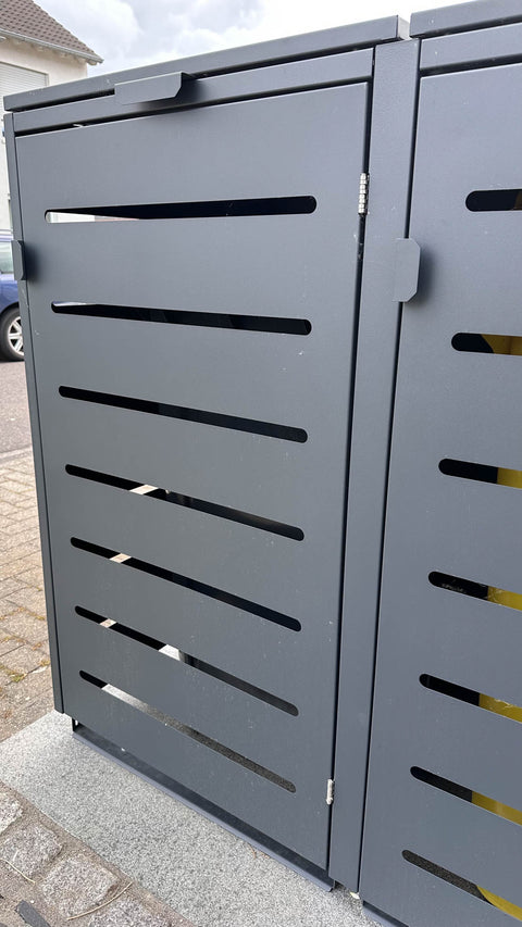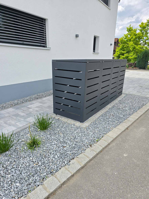 Alubert impresses with high-quality materials such as powder-coated aluminum, corrosion-resistant stainless steel (A2), and galvanized steel, guaranteeing a long service life and maximum weather resistance. The cladding is suitable for trash bins from 60 to 240 liters and fits perfectly into any environment with its elegant anthracite design (RAL 7016).