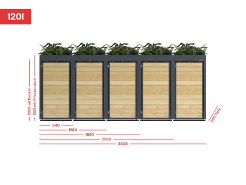 De afvalcontainerboxen Holzmichl zijn geschikt voor 2 tot 5 afvalcontainers. De afmetingen in de afbeelding zijn in mm. Details kun je nalezen in onze Holzmichl handleiding: