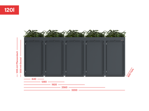Die Mülltonnenboxen Stahlfred sind für 1 bis 6 Mülltonnen geeignet. Die Maße der Abbildung sind in mm. Details kannst du in unserem Stahlfred Handbuch nachlesen:
